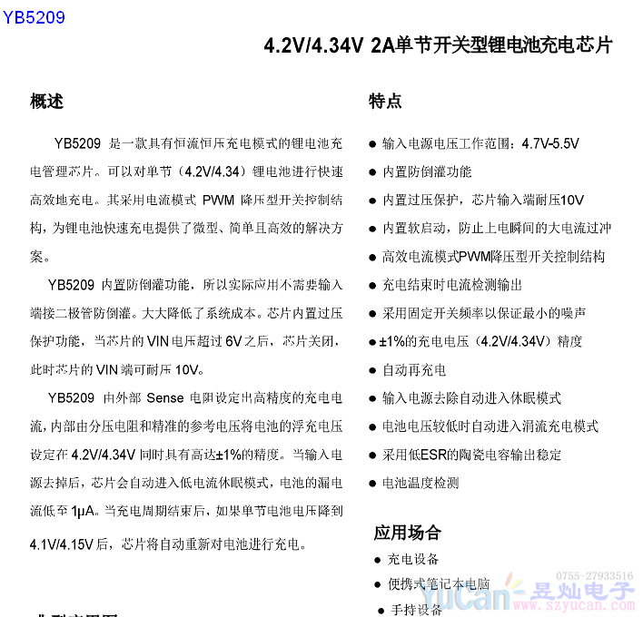 YB5209 SOP8 內置mos 開關式單節(jié) 4.2V 4.35V鋰電充電IC 最大2A充電電流