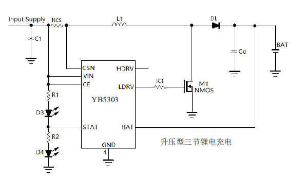 YB5303是一款工作于2.7V到6.5V的PFM升壓型三節(jié)鋰電池充電控制集成電路。YB5303采用恒流和準(zhǔn)恒壓模式(Quasi-CVM)對電池進(jìn)行充電管理,內(nèi)部集成有基準(zhǔn)電壓源,電感電流檢測單元,電池電壓檢測電路和片外場效應(yīng)晶體管驅(qū)動(dòng)電路等,具有外部元件少,電路簡單等優(yōu)點(diǎn)。當(dāng)接通輸入電源后,YB5303進(jìn)入充電狀態(tài),控制片外N溝道MOSFET導(dǎo)通,電感電流上升,當(dāng)上升到外部電流檢測電阻設(shè)置的上限時(shí),片外N溝道 MOSFET截止,電感電流下降,電感中的能量轉(zhuǎn)移到電池中。當(dāng)電感電流下降到外部電流檢測電阻設(shè)置的下限時(shí),片外N溝道MOSFET再次導(dǎo)通,如此循環(huán)。當(dāng)BAT管腳電壓第一次達(dá)到內(nèi)部設(shè)置的12.6V(典型值時(shí),YB5303進(jìn)入準(zhǔn)恒壓充電模式,以較小電流對電池充電。只有當(dāng)BAT管腳電壓第二次達(dá)到12.6V時(shí),充電過程才結(jié)束,片外N溝道MOSFET保持截止?fàn)顟B(tài)。當(dāng)BAT管腳電壓下降到再充電閾值時(shí),YB5303再次進(jìn)入充電狀態(tài)。 YB303最高工作頻率可達(dá)1MHz,工作溫度范圍從-40℃到+85℃。當(dāng)電池電壓低于輸入電壓或電池短路時(shí),YB5303在片外N溝道MOSFET和P溝道MOSFET的共同作用下,用較小電流繼續(xù)對電池充電,對電池起到保護(hù)作用。其他功能包括芯片使能輸入,狀態(tài)指示輸出端等。 YB5303采用8管腳的SOP8封裝。
